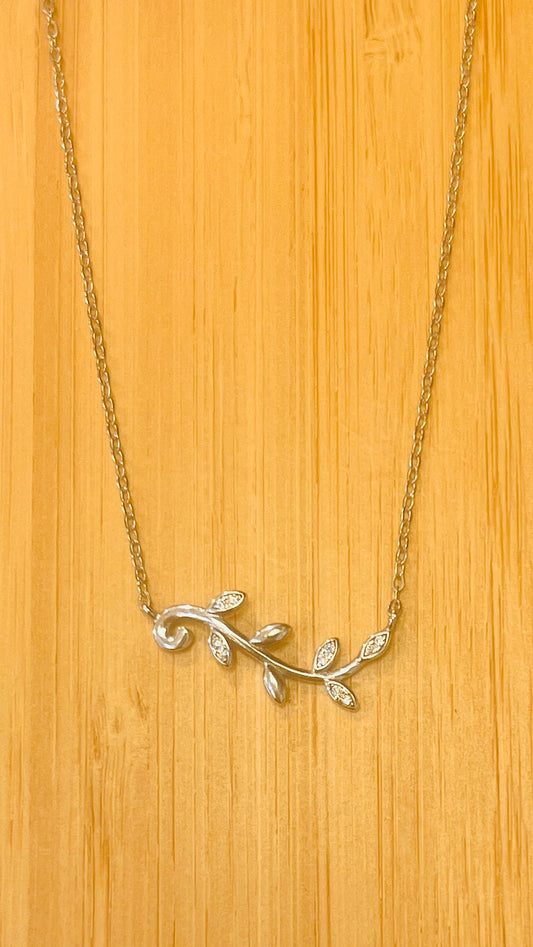 Kusuz Sterling Silver Olive Vine Branch Necklace – with CZ Crystals
