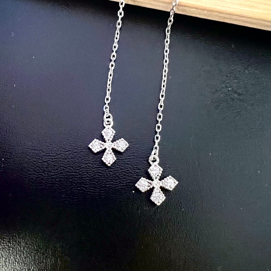 Sterling Silver Clover White Crystal Long Threader Earrings
